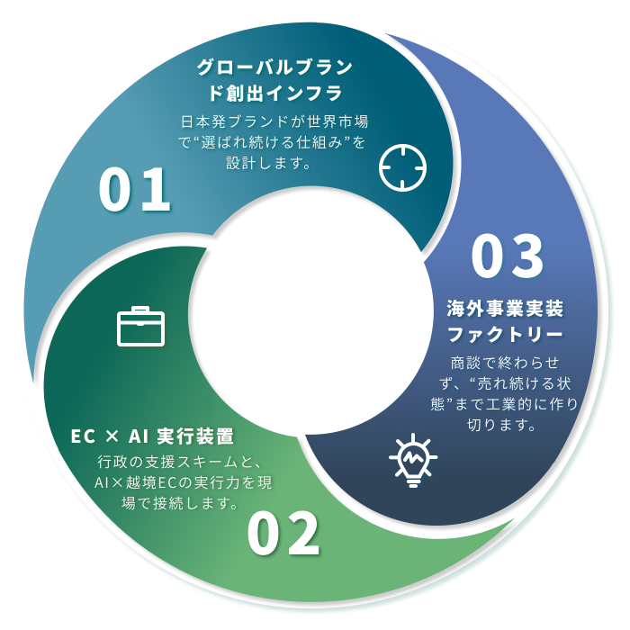 私たちは、海外で勝てる日本企業を、構造的に“量産”する実行インフラです。
